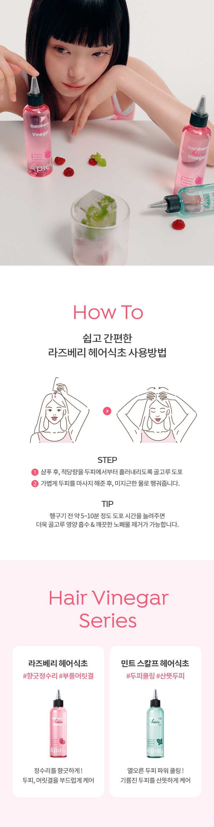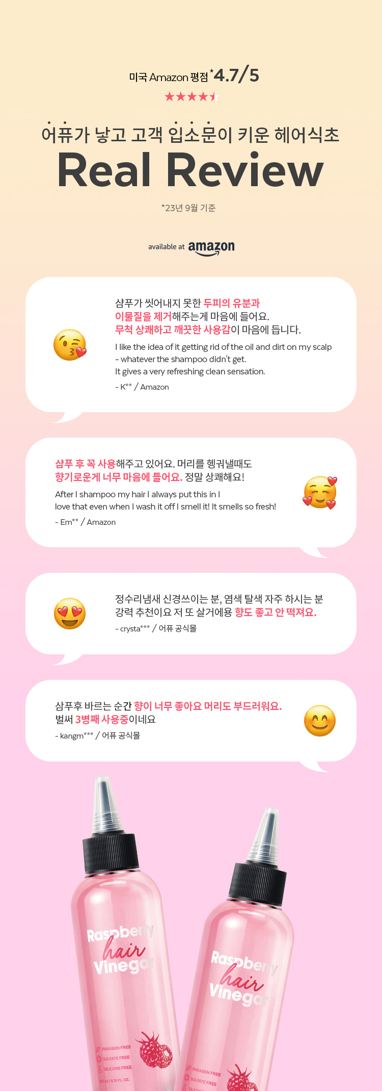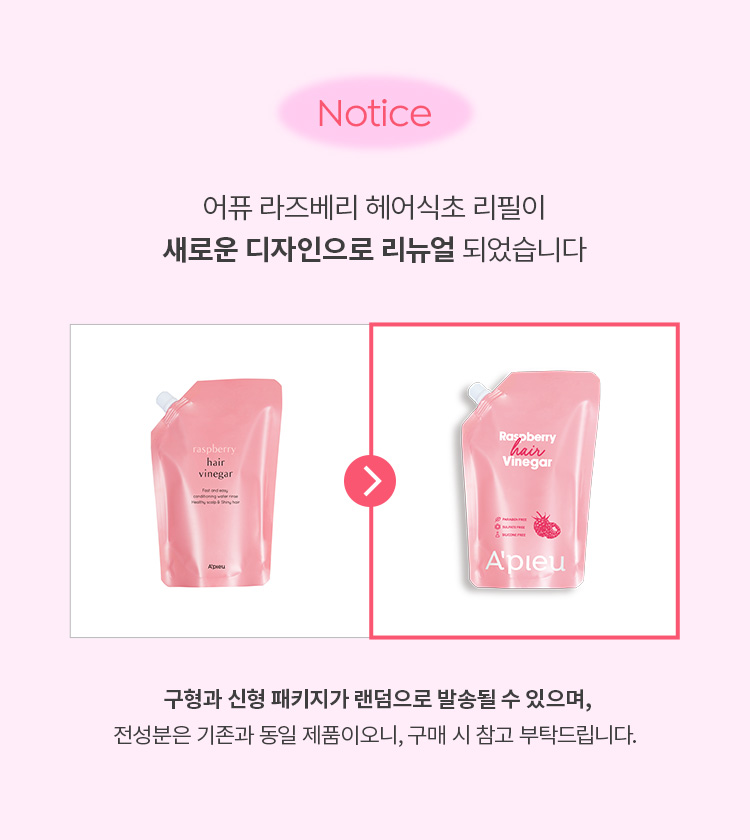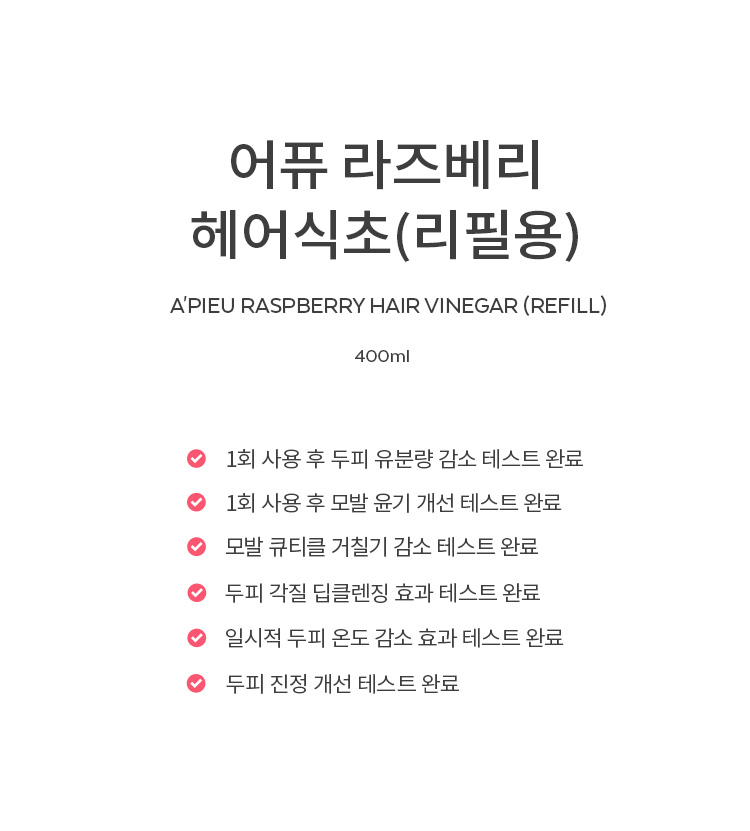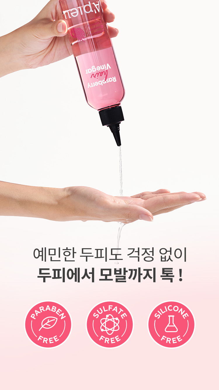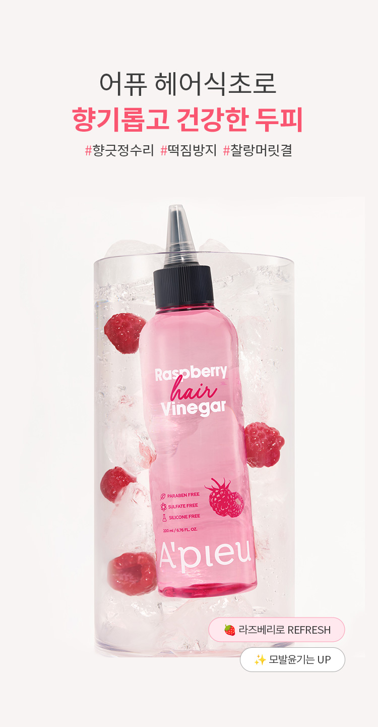 | 전성분 | 정제수, 비니거(20,000ppm), 부틸렌글라이콜, 라즈베리추출물(126ppm), 라즈베리씨오일/토코페릴석시네이트아미노프로판다이 올에스터(0.01ppm), 라벤더추출물, 티트리잎추출물, 로즈마리잎추출물, 효모발효여과물, 하이드롤라이즈드옥수수단백질, 하이드롤라이즈 드콩단백질, 하이드롤라이즈드밀단백질, 옥틸도데세스-16, 피이지-60하이드로제네이티드캐스터오일, 글리세린, 세트리모늄클로라이드, 카프릴릴글라이콜, 폴리쿼터늄-7, 1,2-헥산다이올, 소듐시트레이트, 에틸헥실글리세린, 변성알코올, 다이소듐이디티에이, 소듐벤조에이트, 페녹시에탄올, 향료, 리모넨, 리날룰, 헥실신남알, 벤질살리실레이트 |