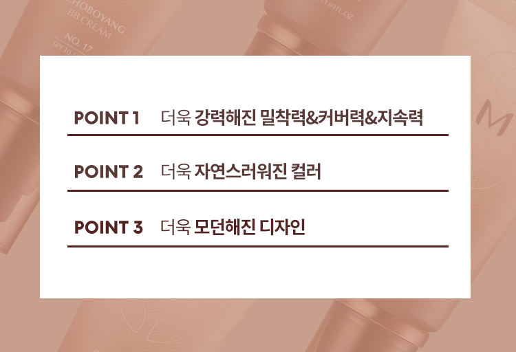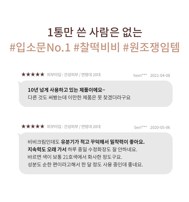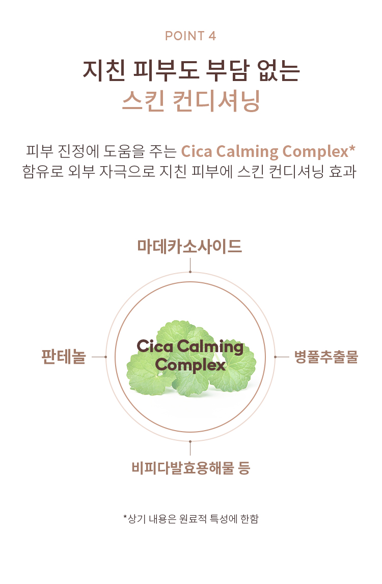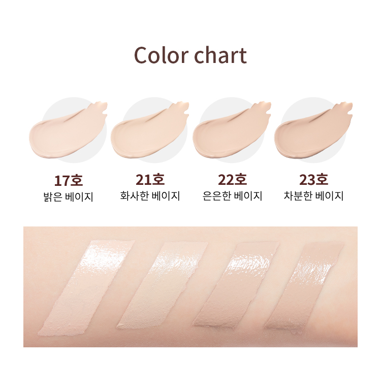 | 전성분 | [17호 밝은 베이지] 정제수, 티타늄디옥사이드, 사이클로펜타실록세인, 다이프로필렌글라이콜, 페닐트라이메티콘, 부틸옥틸살리실레이트, 세틸피이지/피피지-10/1다이메티콘, 부틸렌글라이콜, 사이클로헥사실록세인, 나이아신아마이드, 탤크, 칼슘스테아레이트, 마그네슘설페이트, 솔비탄세스퀴올리에이트, 황색산화철, 토코페릴아세테이트, 다이메티콘, 합성비즈왁스, 알루미늄하이드록사이드, 하이드로제네이티드폴리아이소부텐, 스테아릭애씨드, 페녹시에탄올, 카프릴릴글라이콜, 적색산화철, 글리세린, 트라이에톡시카프릴릴실레인, 다이스테아다이모늄헥토라이트, 흑색산화철, 실리카, 에탄올, 1,2-헥산다이올, 다이소듐이디티에이, 트라이에틸시트레이트, 하이드록시에틸셀룰로오스, 아데노신, 향료, 다이메티콘크로스폴리머, 에틸헥실글리세린, 비즈왁스, 다이메티콘/비닐다이메티콘크로스폴리머, 셀룰로오스, 소듐하이알루로네이트, 폴리메틸실세스퀴옥세인, 금, 비피다발효용해물, 병풀추출물, 락토오스, 실리카실릴레이트, 판테놀, 다이소듐스테아로일글루타메이트, 다이소듐포스페이트, 폴리솔베이트60, 마데카소사이드, 소듐포스페이트, 산양삼추출물, 부틸페닐메틸프로피오날, 벤질벤조에이트 [21호 화사한 베이지] 정제수, 티타늄디옥사이드, 사이클로펜타실록세인, 다이프로필렌글라이콜, 페닐트라이메티콘, 부틸옥틸살리실레이트, 세틸피이지/피피지-10/1다이메티콘, 부틸렌글라이콜, 사이클로헥사실록세인, 나이아신아마이드, 탤크, 칼슘스테아레이트, 마그네슘설페이트, 솔비탄세스퀴올리에이트, 황색산화철, 토코페릴아세테이트, 다이메티콘, 합성비즈왁스, 알루미늄하이드록사이드, 하이드로제네이티드폴리아이소부텐, 적색산화철, 스테아릭애씨드, 페녹시에탄올, 카프릴릴글라이콜, 트라이에톡시카프릴릴실레인, 글리세린, 다이스테아다이모늄헥토라이트, 흑색산화철, 실리카, 에탄올, 1,2-헥산다이올, 다이소듐이디티에이, 트라이에틸시트레이트, 하이드록시에틸셀룰로오스, 아데노신, 향료, 다이메티콘크로스폴리머, 에틸헥실글리세린, 비즈왁스, 다이메티콘/비닐다이메티콘크로스폴리머, 셀룰로오스, 소듐하이알루로네이트, 폴리메틸실세스퀴옥세인, 금, 비피다발효용해물, 병풀추출물, 락토오스, 실리카실릴레이트, 판테놀, 다이소듐스테아로일글루타메이트, 다이소듐포스페이트, 폴리솔베이트60, 마데카소사이드, 소듐포스페이트, 산양삼추출물, 부틸페닐메틸프로피오날, 벤질벤조에이트 [22호 은은한 베이지] 정제수, 티타늄디옥사이드, 사이클로펜타실록세인, 다이프로필렌글라이콜, 페닐트라이메티콘, 부틸옥틸살리실레이트, 세틸피이지/피피지-10/1다이메티콘, 부틸렌글라이콜, 사이클로헥사실록세인, 나이아신아마이드, 탤크, 칼슘스테아레이트, 마그네슘설페이트, 솔비탄세스퀴올리에이트, 황색산화철, 토코페릴아세테이트, 다이메티콘, 합성비즈왁스, 알루미늄하이드록사이드, 적색산화철, 하이드로제네이티드폴리아이소부텐, 스테아릭애씨드, 흑색산화철, 페녹시에탄올, 카프릴릴글라이콜, 트라이에톡시카프릴릴실레인, 글리세린, 다이스테아다이모늄헥토라이트, 실리카, 에탄올, 1,2-헥산다이올, 다이소듐이디티에이, 트라이에틸시트레이트, 하이드록시에틸셀룰로오스, 아데노신, 향료, 다이메티콘크로스폴리머, 에틸헥실글리세린, 비즈왁스, 다이메티콘/비닐다이메티콘크로스폴리머, 셀룰로오스, 소듐하이알루로네이트, 폴리메틸실세스퀴옥세인, 금, 비피다발효용해물, 병풀추출물, 락토오스, 실리카실릴레이트, 판테놀, 다이소듐스테아로일글루타메이트, 다이소듐포스페이트, 폴리솔베이트60, 마데카소사이드, 소듐포스페이트, 산양삼추출물, 부틸페닐메틸프로피오날, 벤질벤조에이트 [23호 차분한 베이지] 정제수, 티타늄디옥사이드, 사이클로펜타실록세인, 다이프로필렌글라이콜, 페닐트라이메티콘, 부틸옥틸살리실레이트, 세틸피이지/피피지-10/1다이메티콘, 부틸렌글라이콜, 사이클로헥사실록세인, 나이아신아마이드, 탤크, 칼슘스테아레이트, 황색산화철, 마그네슘설페이트, 솔비탄세스퀴올리에이트, 토코페릴아세테이트, 다이메티콘, 합성비즈왁스, 알루미늄하이드록사이드, 적색산화철, 하이드로제네이티드폴리아이소부텐, 흑색산화철, 스테아릭애씨드, 트라이에톡시카프릴릴실레인, 페녹시에탄올, 카프릴릴글라이콜, 글리세린, 다이스테아다이모늄헥토라이트, 실리카, 에탄올, 1,2-헥산다이올, 다이소듐이디티에이, 트라이에틸시트레이트, 하이드록시에틸셀룰로오스, 아데노신, 향료, 다이메티콘크로스폴리머, 에틸헥실글리세린, 비즈왁스, 다이메티콘/비닐다이메티콘크로스폴리머, 셀룰로오스, 소듐하이알루로네이트, 폴리메틸실세스퀴옥세인, 금, 비피다발효용해물, 병풀추출물, 락토오스, 실리카실릴레이트, 판테놀, 다이소듐스테아로일글루타메이트, 다이소듐포스페이트, 폴리솔베이트60, 마데카소사이드, 소듐포스페이트, 산양삼추출물, 부틸페닐메틸프로피오날, 벤질벤조에이트 |
