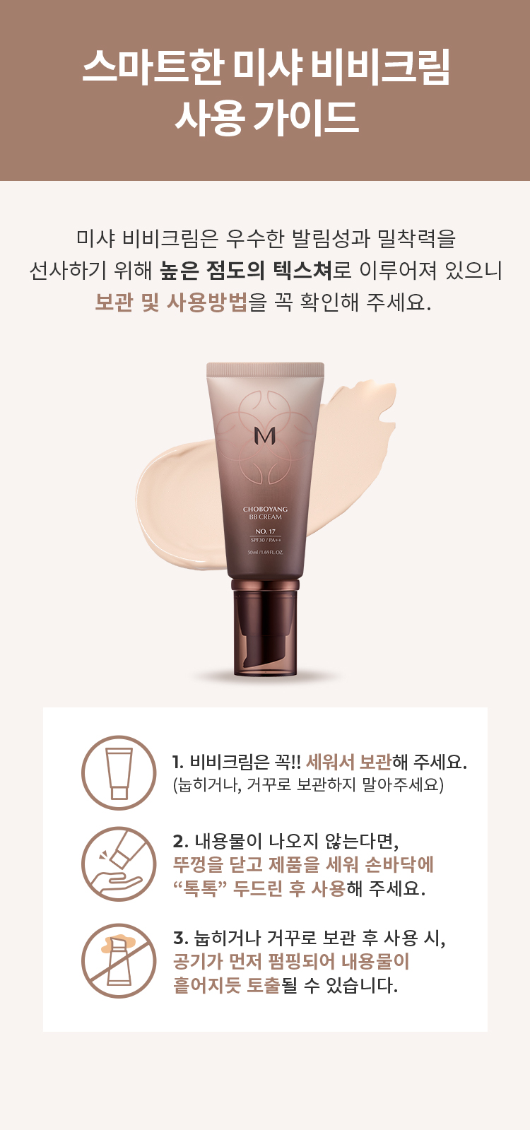 | 사용할 때의 주의사항 | 1. 화장품 사용 시 또는 사용 후 직사광선에 의하여 사용부위가 붉은 반점, 부어오름 또는 가려움증 등의 이상 증상이나 부작용이 있는 경우 전문의 등과 상담할 것 2. 상처가 있는 부위 등에는 사용을 자제할 것 3. 보관 및 취급 시의 주의사항 가) 어린이의 손이 닿지 않는 곳에 보관할 것 나) 직사광선을 피해서 보관할 것 |