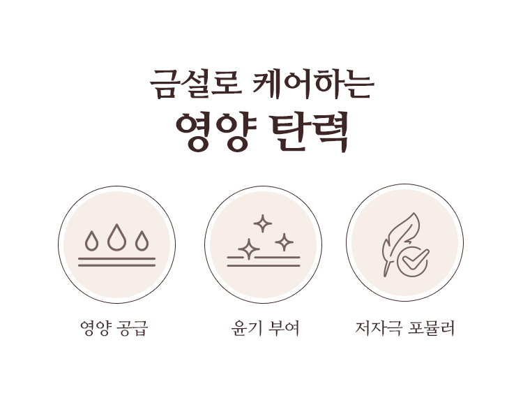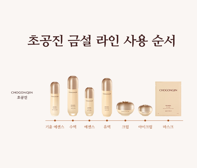 | 전성분 | [금설 진 수액] 정제수,글리세린,메틸프로판다이올,1,2-헥산다이올,나이아신아마이드,비스-피이지-18메틸에터다이메틸실레인,카보머,옥틸도데세스-16,잔탄검,부틸렌글라이콜,헥실데실에틸헥사노에이트,펜타에리스리틸테트라에틸헥사노에이트,트로메타민,하이드록시아세토페논,에틸헥실글리세린,하이드로제네이티드레시틴,아데노신,다이소듐이디티에이,글리세릴폴리메타크릴레이트,향료,피브이엠/엠에이코폴리머,폴리글리세릴-10스테아레이트,베타인,소듐폴리아크릴레이트,무화과추출물,병풀추출물,줄맨드라미씨추출물,당느릅나무뿌리추출물,세라마이드엔피,더덕뿌리추출물,비에이치티,금,타임추출물,참당귀뿌리추출물,산수유열매추출물,녹용추출물,로얄젤리추출물,하이드롤라이즈드하이알루로닉애씨드,토코페롤 [금설 진 유액] 정제수, 글리세린, 메틸프로판다이올, 부틸렌글라이콜다이카프릴레이트/다이카프레이트, 사이클로헥사실록세인, 1, 2-헥산다이올, 나이아신아마이드, 시어버터, 폴리글리세릴-3메틸글루코오스다이스테아레이트, 다시마추출물, 한련초잎추출물, 인도멀구슬나무꽃추출물, 인도멀구슬나무잎추출물, 당느릅나무뿌리추출물, 줄맨드라미씨추출물, 무화과추출물, 병풀추출물, 울금뿌리추출물, 홀리바질잎추출물, 로얄젤리추출물, 더덕뿌리추출물, 참산호말추출물, 녹용추출물, 산수유열매추출물, 참당귀뿌리추출물, 타임추출물, 하이드로제네이티드레시틴, 세테아릴알코올, 세테아릴올리베이트, C12-16알코올, 솔비탄올리베이트, 암모늄아크릴로일다이메틸타우레이트/브이피코폴리머, 부틸렌글라이콜, 베헤닐알코올, 팔미틱애씨드, 잔탄검, 에틸헥실글리세린, 다이프로필렌글라이콜, 글리세릴스테아레이트에스이, 아데노신, 다이소듐이디티에이, 콜레스테롤, 프룩토올리고사카라이드, 세라마이드엔피, 베타-글루칸, 하이드롤라이즈드하이알루로닉애씨드, 금, 토코페롤, 향료 [금설 진 크림] 정제수, 다이프로필렌글라이콜, 글리세린, 하이드로제네이티드폴리데센, 다이카프릴릴에터, 비닐다이메티콘, 글리세릴스테아레이트, 나이아신아마이드, 다이아이소스테아릴말레이트, 베타인, 카프릴릭/카프릭트라이글리세라이드, 펜타에리스리틸테트라에틸헥사노에이트, 세테아릴알코올, 메도우폼씨오일, 트레할로오스, 아이비고드열매추출물, 한련초추출물, 황벽나무껍질추출물, 무화과추출물, 병풀추출물, 녹용추출물, 산수유열매추출물, 참당귀뿌리추출물, 타임추출물, 로얄젤리추출물, 더덕뿌리추출물, 오일팜오일, 소듐하이알루로네이트, 하이드로제네이티드레시틴, 폴리글리세릴-3다이스테아레이트, 폴리글리세릴-10라우레이트, 1,2-헥산다이올, 폴리글리세릴-6다이스테아레이트, 폴리아크릴레이트-13, 하이드록시에틸아크릴레이트/소듐아크릴로일다이메틸타우레이트코폴리머, 소듐스테아로일글루타메이트, 베헤닐알코올, 하이드록시아세토페논, 다이메티콘올, 하이드로제네이티드폴리아이소부텐, 호호바에스터, 에탄올, 에틸헥실글리세린, 세틸알코올, 잔탄검, 폴리글리세릴-3비즈왁스, 메틸프로판다이올, 솔비탄아이소스테아레이트, 부틸렌글라이콜, 글리세릴스테아레이트시트레이트, 아데노신, 다이소듐이디티에이, 에틸헥실팔미테이트, 토코페롤, 금(10 ppm), 세라마이드엔피, 향료 [소생 진 에센스] 정제수, 글리세린, 다이프로필렌글라이콜, 부틸렌글라이콜, 피이지-75, 변성알코올, 1,2-헥산다이올, 나이아신아마이드, 폴리글리세린-3, 펜틸렌글라이콜, 시어버터, 아이리쉬모스추출물, 진흙버섯추출물, 클로렐라 불가리스추출물, 사탕수수추출물, 인도멀구슬나무꽃추출물, 홀리바질잎추출물, 카카오추출물, 인도멀구슬나무잎추출물, 울금뿌리추출물, 하이드롤라이즈드옥수수전분, 참산호말추출물, 홍삼추출물, 참당귀추출물, 산수유열매추출물, 타임추출물, 수용성콜라겐, 녹용추출물, 해바라기씨오일, 칸디다 봄비콜라/글루코오스/메틸레이프씨데이트발효물, 마카다미아씨오일, 다이메티콘, 판테놀, 다이에톡시에틸석시네이트, 글루코오스, 피이지-60하이드로제네이티드캐스터오일, 트로메타민, 아크릴레이트/C10-30알킬아크릴레이트크로스폴리머, 프룩토올리고사카라이드, 프룩토오스, 하이드로제네이티드레시틴, 소듐폴리아크릴레이트, 글리세릴폴리아크릴레이트, 스테아레스-20, 아데노신, 덱스트린, 소듐파이테이트, 수크로오스, 베타-글루칸, 팔미토일트 라이펩타이드-5, 에틸헥실글리세린, 폴리글리세릴-10스테아레이트, 소듐스테아로일글루타메이트, 카보머, 잔탄검, 세테아릴알코올, 페녹시에탄올, 향료, 벤질살리실레이트, 알파-아이소메틸아이오논, 시트로넬올 [소생 진 크림] 정제수, 다이프로필렌글라이콜, 다이메티콘, 사이클로펜타실록세인, 부틸렌글라이콜, 글리세린, 세테아릴알코올, 피씨에이다이메티콘, 펜틸렌글라이콜, 글리세레스-26, 나이아신아마이드, 페트롤라툼, 트라이실록세인, 글리세릴스테아레이트에스이, 진흙버섯추출물, 클로렐라 불가리스추출물, 카카오추출물, 퀸즈랜드넛오일, 백미꽃추출물, 접시꽃추출물, 참당귀추출물, 