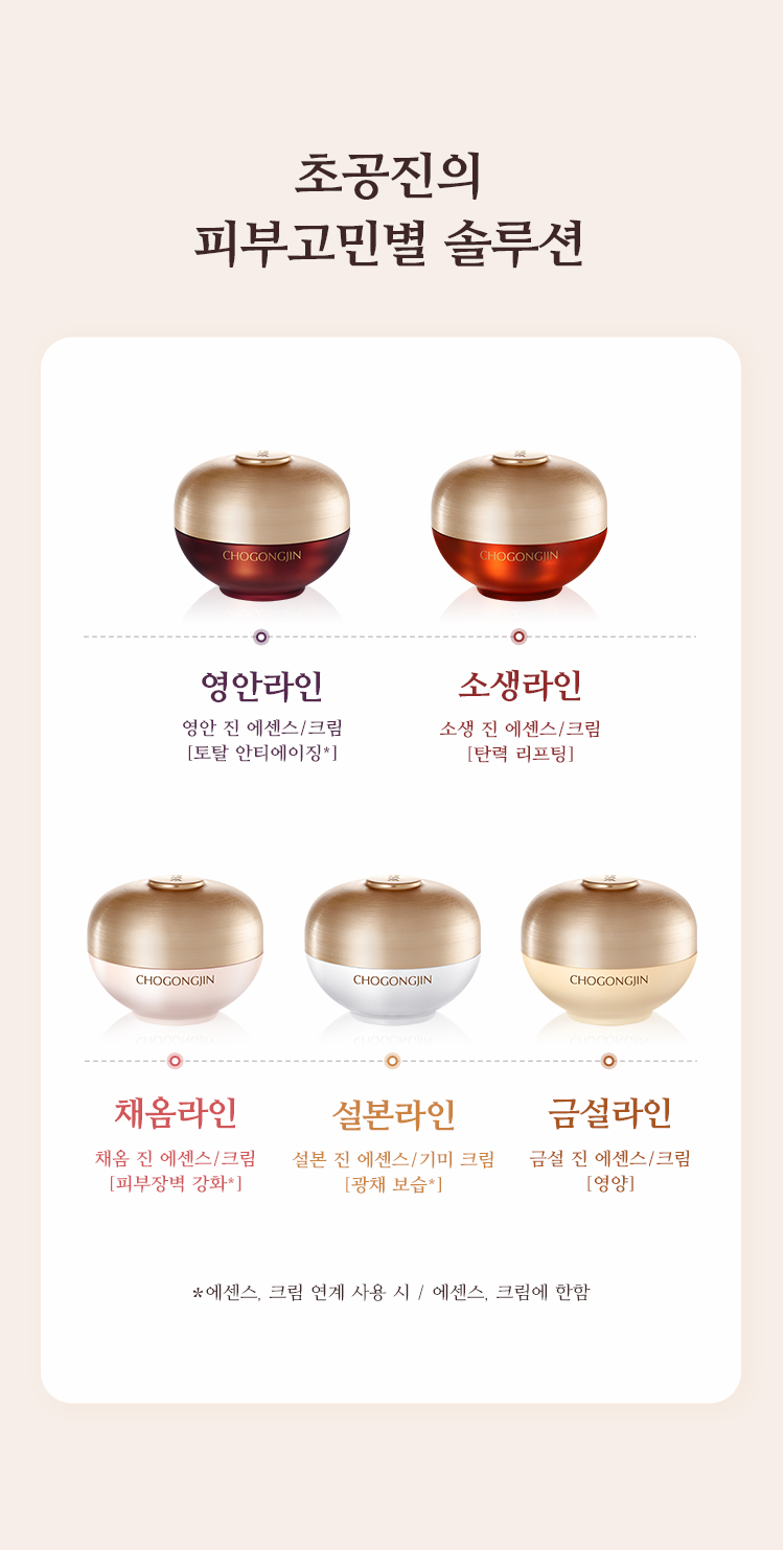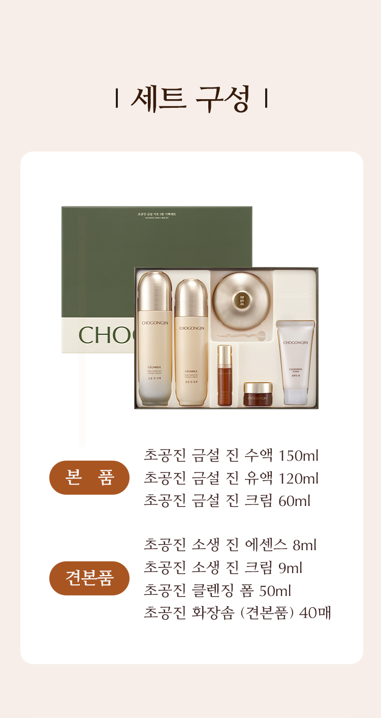 | 용량/중량 | 본품: 수액150ml, 유액120ml, 크림60ml 증정: 소생 진 에센스8ml, 소생 진 크림9ml, 클렌징폼50ml, 화장솜 40매 |