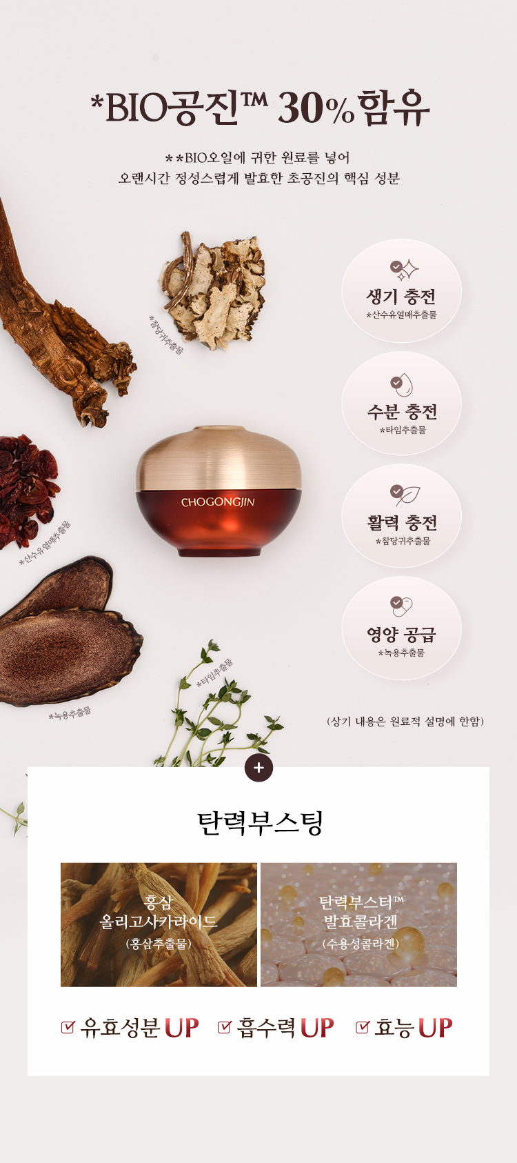 | 전성분 | 정제수, 부틸렌글라이콜, 시어버터, 하이드로제네이티드폴리(C6-14올레핀), 다이메티콘, 메도우폼씨오일, 펜타에리스리틸테트라에틸헥사노에이트, 베헤닐알코올, 나이아신아마이드, 스테아릴알코올, 사이클로펜타실록세인, 펜틸렌글라이콜, 폴리글리세릴-3메틸글루코오스다이스테아레이트, 하이드록시프로필스타치포스페이트, 포타슘세틸포스페이트, 1,2-헥산다이올, 사이클로헥사실록세인, 진흙버섯추출물, 아이리쉬모스추출물, 클로렐라 불가리스추출물, 사탕수수추출물, 카카오추출물, 칸디다 봄비콜라/글루코오스/메틸레이프씨데이트발효물, 백미꽃추출물, 홍삼추출물, 수용성콜라겐, 참당귀추출물, 산수유열매추출물, 타임추출물, 녹용추출물, 마카다미아씨오일, 접시꽃추출물, 해바라기씨오일, 글리세릴스테아레이트, 다이아이소스테아릴말레이트, 실리카, 아크릴레이트/C10-30알킬아크릴레이트크로스폴리머, 카프릴릴글라이콜, 세테아릴글루코사이드, 글루코오스, 프룩토올리고사카라이드, 프룩토오스, 포타슘하이드록사이드, 글리세린, 다이포타슘글리시리제이트, 아데노신, 소듐파이테이트, 덱스트린 , 토코페롤, 에틸헥실글리세린, 폴리글리세릴-10스테아레이트, 소듐스테아로일글루타메이트, 세테아릴알코올, 틴옥사이드, 페녹시에탄올, 향료, 벤질살리실레이트, 알파-아이소메틸아이오논, 시트로넬올, 제라니올, 리날룰, 리모넨, 하이드록시시트로넬알, 헥실신남알, 마이카 (CI 77019), 티타늄디옥사이드 (CI 77891) |