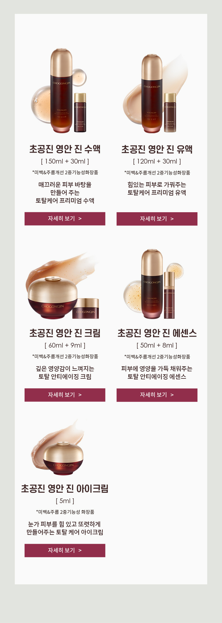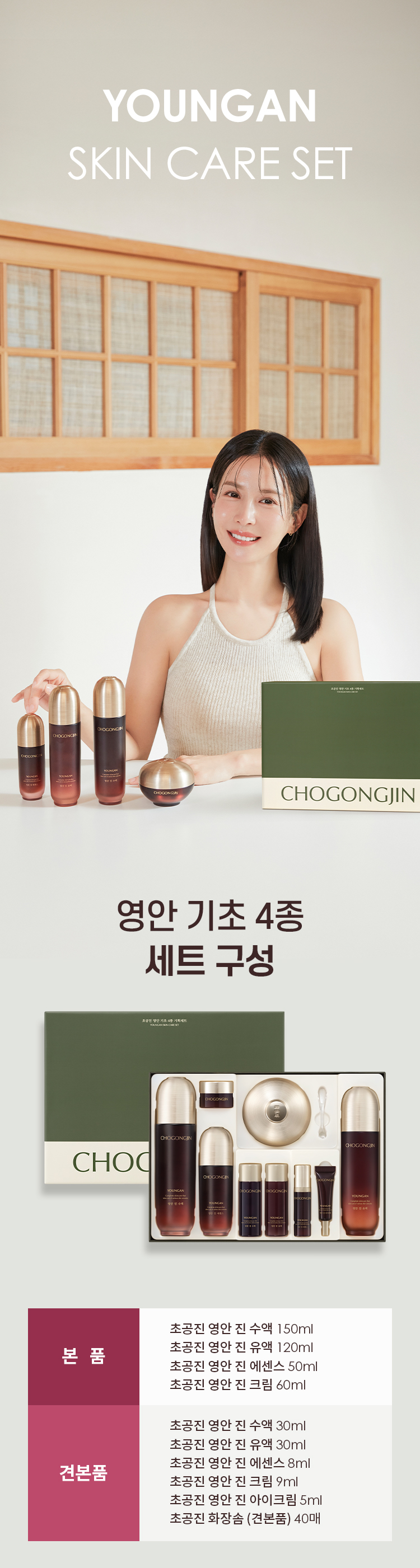 | 용량/중량 | 본품: 수액150ml, 유액120ml, 에센스50ml, 크림60ml 증정: 수액30ml, 유액30ml, 에센스8ml, 크림9ml, 아이크림5ml, 화장솜 40p |