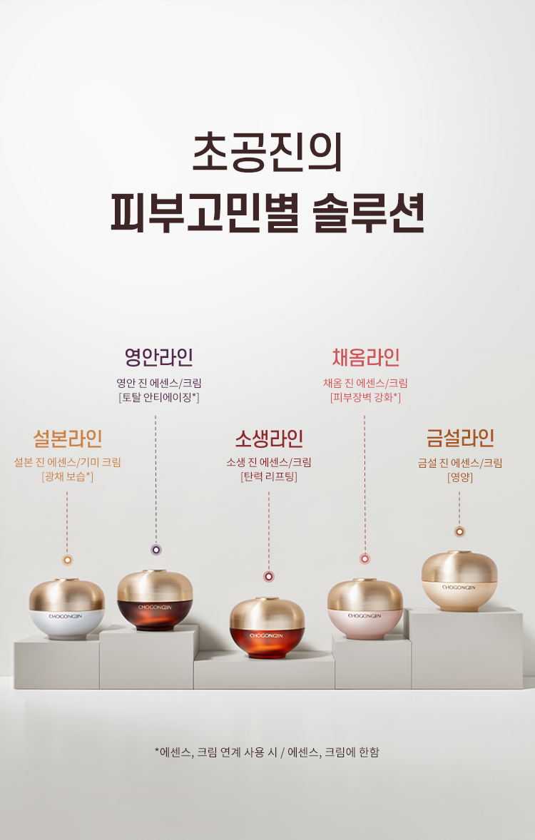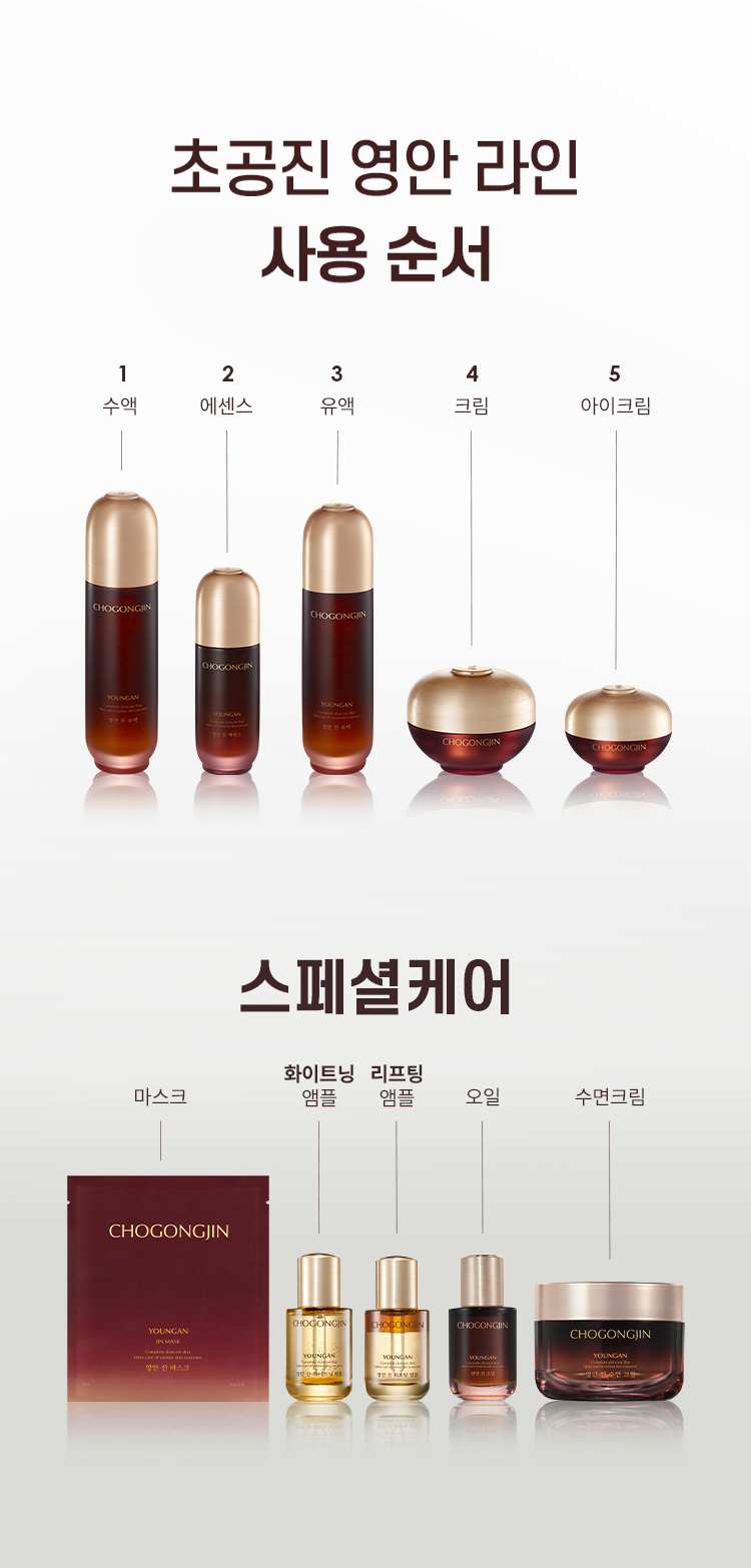 | 전성분 | [영안 진 수액] 정제수, 부틸렌글라이콜, 다이프로필렌글라이콜, 글리세린, 펜틸렌글라이콜, 변성알코올, 글리세레스-26, 나이아신아마이드, 진흙버섯추출물, 카카오추출물, 백미꽃추출물, 접시꽃추출물, 참당귀추출물, 산수유열매추출물, 타임추출물, 해바라기씨오일, 녹용추출물, 칸디다 봄비콜라/글루코오스/메틸레이프씨데이트발효물, 하이드롤라이즈드하이알루로닉애씨드, 흑삼추출물, 마카다미아씨오일, 라피노오스, 피이지-60하이드로제네이티드캐스터오일, 아크릴레이트/C10-30알킬아크릴레이트크로스폴리머, 트로메타민, 프로판다이올, 옥틸도데세스-16, 아데노신, 덱스트린, 1,2-헥산다이올, 바이오사카라이드검-1, 베타-글루칸, 에틸헥실글리세린, 사이아노코발아민, 폴리글리세릴-10스테아레이트, 3-O-에틸아스코빅애씨드, 소듐스테아로일글루타메이트, 메틸프로판다이올, 카프릴릴글라이콜, 하이드롤라이즈드엘라스틴, 아세틸헥사펩타이드-8, 잔탄검, 다이소듐이디티에이, 세테아릴알코올, 향료, 벤질살리실레이트, 알파-아이소메틸아이오논, 시트로넬올 [영안 진 유액] 정제수, 글리세린, 부틸렌글라이콜, 다이프로필렌글라이콜, 펜타에리스리틸테트라에틸헥사노에이트, 하이드로제네이티드폴리(C6-14올레핀), 네오펜틸글라이콜다이카프레이트, 나이아신아마이드, 펜틸렌글라이콜, 메틸프로판다이올, 폴리글리세릴-3메틸글루코오스다이스테아레이트, 글리세릴스테아레이트, 1,2-헥산다이올, 진흙버섯추출물, 카카오추출물, 인도멀구슬나무꽃추출물, 홀리바질잎추출물, 인도멀구슬나무잎추출물, 울금뿌리추출물, 참산호말추출물, 백미꽃추출물, 칸디다 봄비콜라/글루코오스/메틸레이프씨데이트발효물, 참당귀추출물, 산수유열매추출물, 타임추출물, 접시꽃추출물, 녹용추출물, 해바라기씨오일, 마카다미아씨오일, 하이드롤라이즈드하이알루로닉애씨드, 흑삼추출물, 다이메티콘, 피이지-100스테아레이트, 비즈왁스, 팔미틱애씨드, 스테아릭애씨드, C12-20알킬글루코사이드, 카프릴릴글라이콜, 트로메타민, 카프릴릭/카프릭트라이글리세라이드, 덱스트린, 아데노신, 하이드로제네이티드레시틴, 소듐파이테이트, 세라마이드엔피, 토코페롤, 에틸헥실글리세린, 폴리글리세릴-10스테아레이트, 소듐스테아로일글루타메이트, 3-O-에틸아스코빅애씨드, 하이드롤라이즈드엘라스틴, 아세틸헥사펩타이드-8, C14-22알코올, 세테아릴알코올, 카보머, 잔탄검, 향료, 벤질살리실레이트, 알파-아이소메틸아이오논, 시트로넬올 [영안 진 크림] 정제수, 다이프로필렌글라이콜, 다이메티콘, 사이클로펜타실록세인, 부틸렌글라이콜, 글리세린, 세테아릴알코올, 피씨에이다이메티콘, 펜틸렌글라이콜, 글리세레스-26, 나이아신아마이드, 페트롤라툼, 트라이실록세인, 글리세릴스테아레이트에스이, 진흙버섯추출물, 클로렐라 불가리스추출물, 카카오추출물, 퀸즈랜드넛오일, 백미꽃추출물, 접시꽃추출물, 참당귀추출물, 산수유열매추출물, 타임추출물, 녹용추출물, 하이드롤라이즈드하이알루로닉애씨드, 해바라기씨오일, 칸디다 봄비콜라/글루코오스/메틸레이프씨데이트발효물, 흑삼추출물, 한련초추출물, 인도멀구슬나무잎추출물, 인도멀구슬나무꽃추출물, 홀리바질잎추출물, 울금뿌리추출물, 참산호말추출물, 마카다미아씨오일, 드럼스틱씨오일, 다이메티콘올, 글리세릴스테아레이트, 피이지-100스테아레이트, 암모늄아크릴로일다이메틸타우레이트/브이피코폴리머, 피이지-150다이스테아레이트, 카프릴릴글라이콜, 글루코오스, 프룩토올리고사카라이드, 프룩토오스, 덱스트린, 다이포타슘글리시리제이트, 아데노신, 1,2-헥산다이올, 소듐파이테이트, 세라마이드엔피, 피토스핑고신, 에틸헥실글리세린, 3-O-에틸아스코빅애씨드, 토코페롤, 폴리글리세릴-10스테아레이트, 메틸프로판다이올, 소듐스테아로일글루타메이트, 하이드롤라이즈드엘라스틴, 아세틸헥사펩타이드-8, 잔탄검, 비에이치티, 페녹시에탄올, 향료, 벤질살리실레이트, 알파-아이소메틸아이오논, 시트로넬올, 제라니올, 리날룰, 금 (CI 77480) [영안 진 에센스] 정제수, 글리세린, 피이지-8, 부틸렌글라이콜, 폴리글리세린-3, 변성알코올, 메틸글루세스-20, 나이아신아마이드, 1,2-헥산다이올, 메틸프로판다이올, 펜틸렌글라이콜, 클로렐라 불가리스추출물, 진흙버섯추출물, 카카오추출물, 참당귀추출물, 산수유열매추출물, 타임추출물, 녹용추출물, 해바라기씨오일, 칸디다 봄비콜라/글루코오스/메틸레이프씨데이트발효물, 하이드롤라이즈드하이알루로닉애씨드, 마카다미아씨오일, 흑삼추출물, 글루코오스, 피이지-60하이드로제네이티드캐스터오일, 글리세릴폴리아크릴레이트, 프룩토올리고사카라이드, 프룩토오스, 암모늄아크릴로일다이메틸타우레이트/브이피코폴리머, 옥틸도데세스-16, 소듐폴리아크릴레이트, 에틸헥실글리세린, 아데노신, 덱스트린, 소듐파이테이트, 베타-글루칸, 토코페롤, 폴리글리세릴-10스테아레이트, 소듐스테아로일글루타메이트, 3-O-에틸아스코빅애씨드, 카프릴릴글라이콜, 하이드롤라이즈드엘라스틴, 아세틸헥사펩타이드-8, 