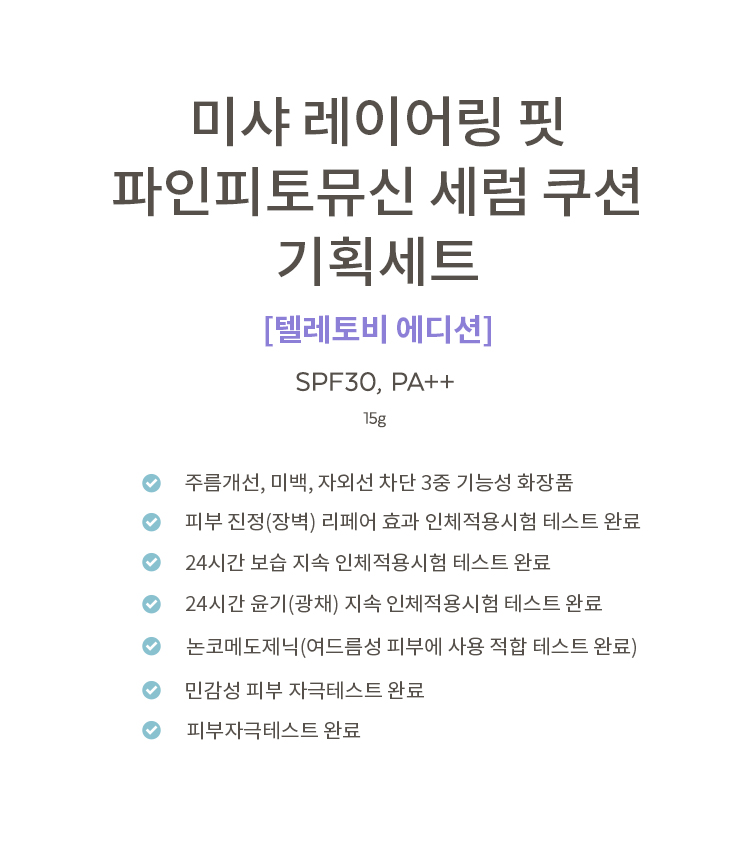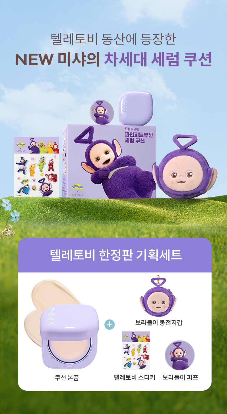| 용량/중량 | 레이어링 핏 파인피토뮤신 세럼 쿠션 (본품) 15 g / 0.52 OZ. 텔레토비 보라돌이 동전지갑 (증정품) 1EA 텔레토비 퍼프 (증정품) 1EA 텔레토비 스티커 (증정품) 1EA |