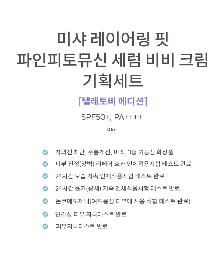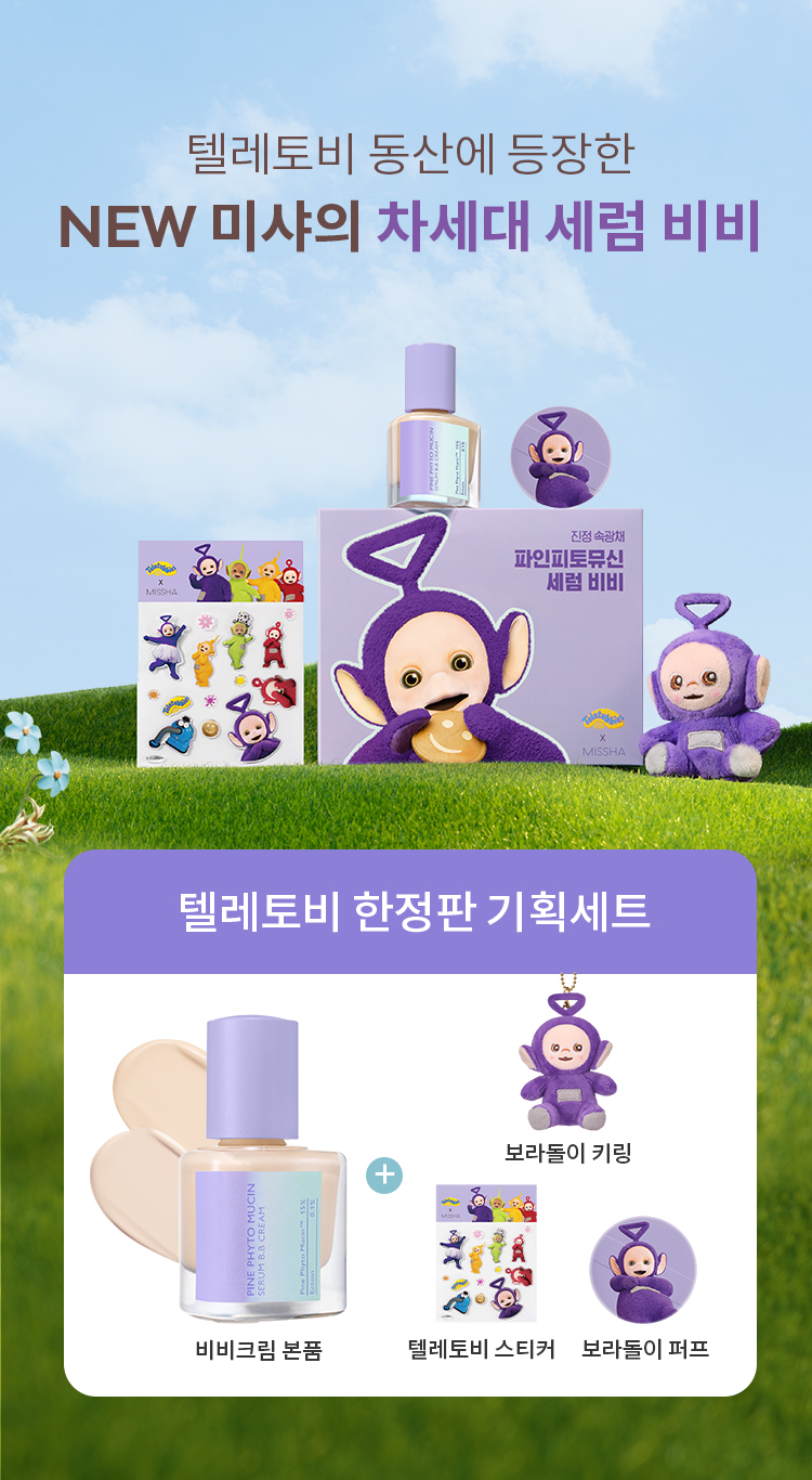 | 용량/중량 | 레이어링 핏 파인피토뮤신 세럼 비비 크림 (본품) 30 ml / 1.01 fl. oz. 텔레토비 보라돌이 키링 (증정품) 1EA 텔레토비 퍼프 (증정품) 1EA 텔레토비 스티커 (증정품) 1EA |