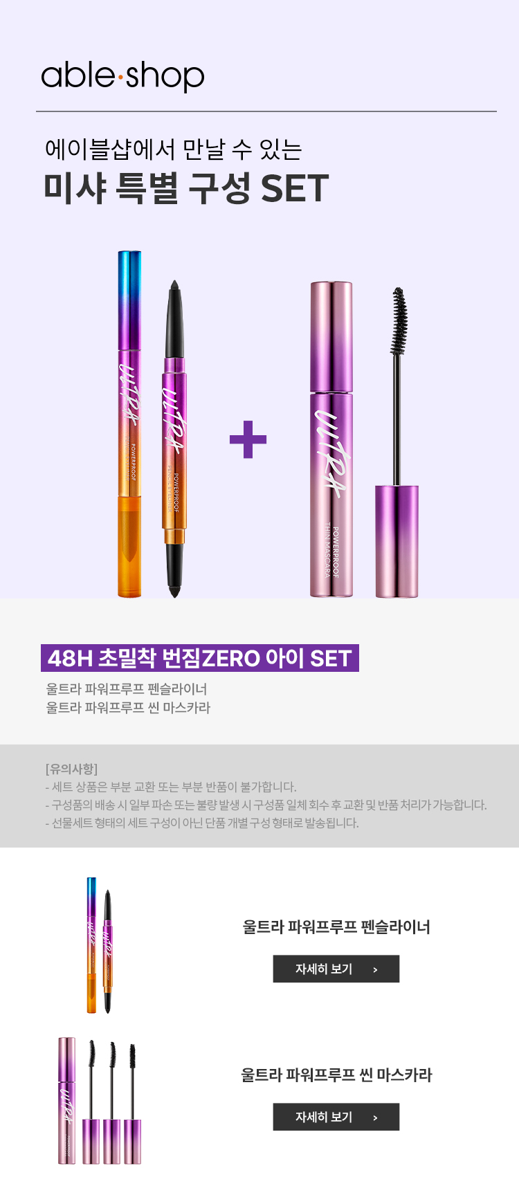 | 제조업자 및 책임판매업자 | 울트라 파워프루프 펜슬 라이너: ㈜믹스앤매치 / ㈜에이블씨엔씨 울트라 파워프루프 씬 마스카라: 한국콜마 / (주)에이블씨엔씨 |