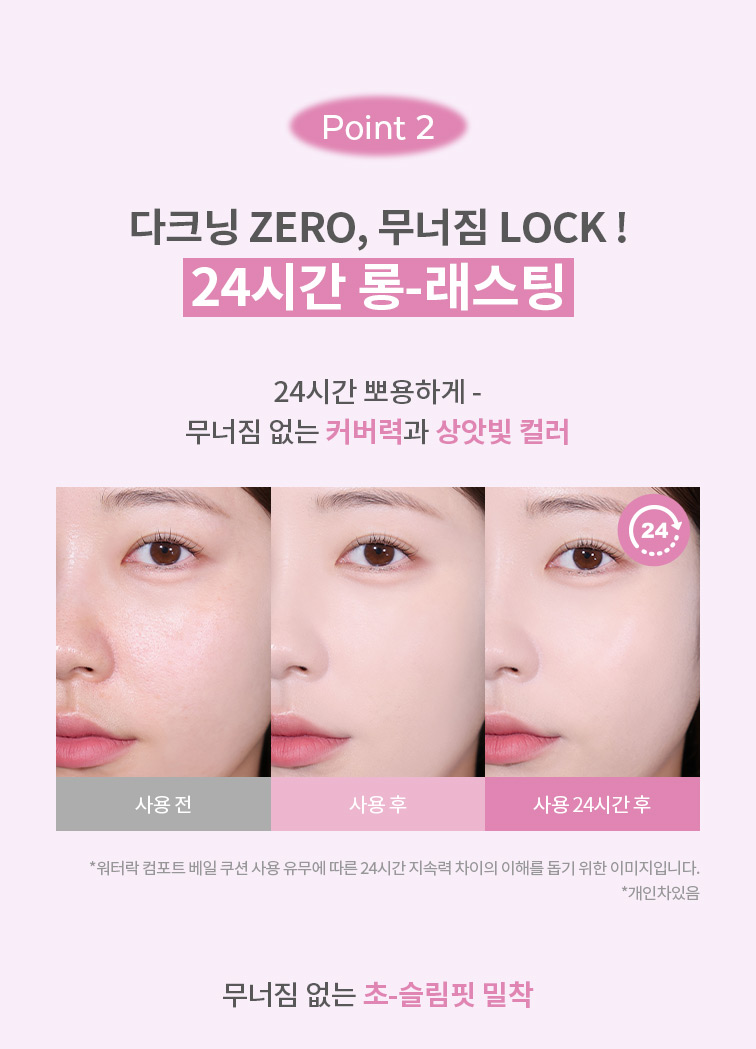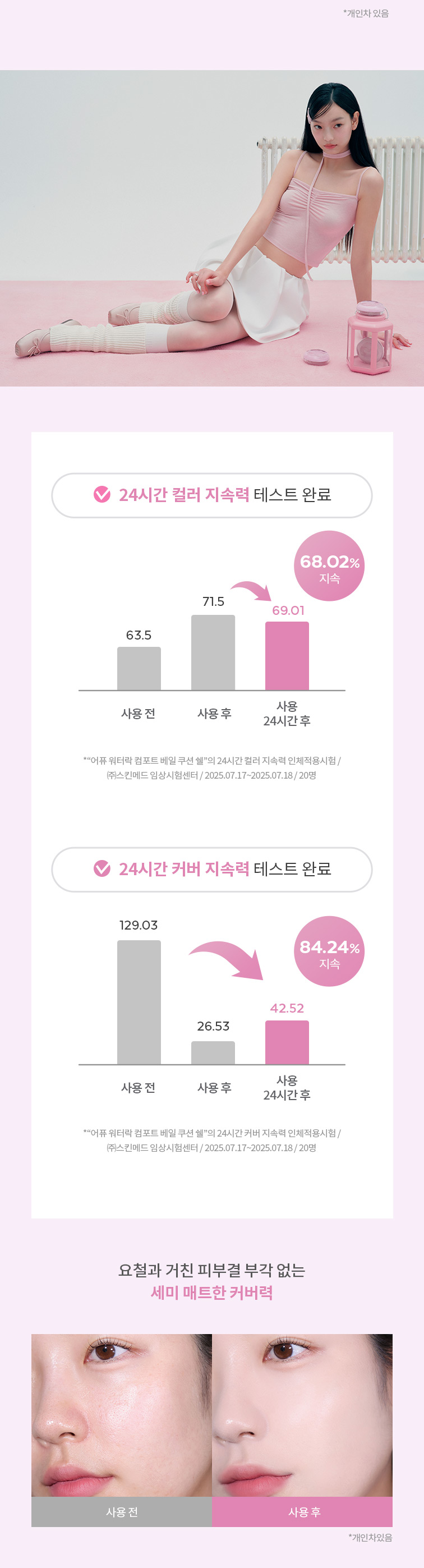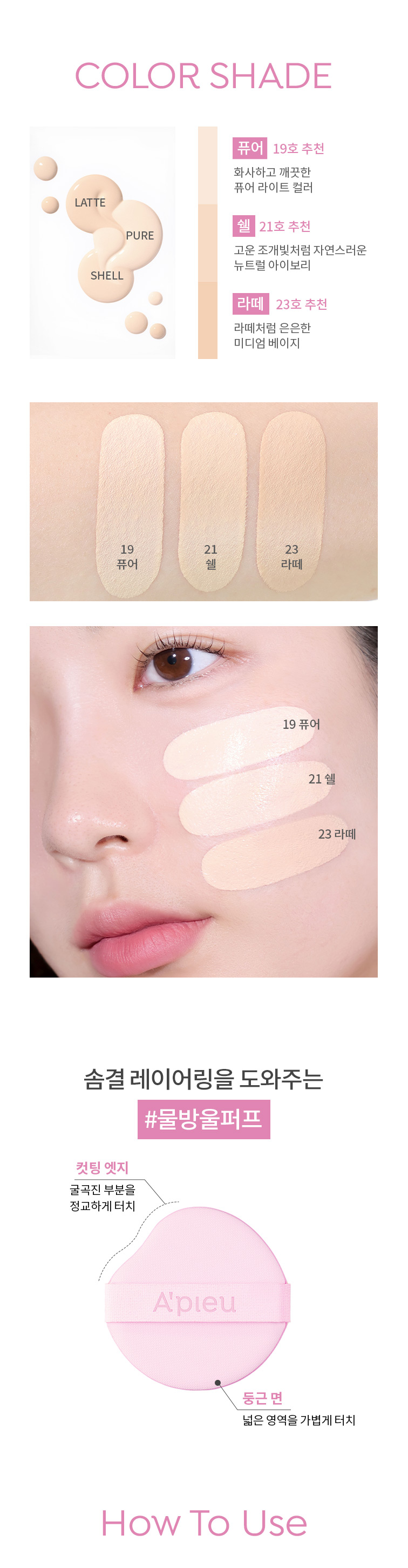 | 전성분 | [19호 퓨어] 정제수, 티타늄디옥사이드 (CI 77891), 다이메티콘, 메틸트라이메티콘, 에칠헥실메톡시신나메이트, 프로판다이올, 에칠헥실살리실레이트, 부틸렌글라이콜다이카프릴레이트/다이카프레이트, 폴리메틸실세스퀴옥세인, 다이페닐실록시페닐트라이메티콘, 나이아신아마이드, 세틸피이지/피피지-10/1다이메티콘, 1,2-헥산다이올, 합성플루오르플로고파이트, 아이소도데케인, 바륨설페이트, 비닐다이메티콘/메티콘실세스퀴옥세인크로스폴리머, 라우릴피이지-10트리스(트라이메틸실록시)실릴에틸다이메티콘, 다이스테아다이모늄헥토라이트, 실리카, 마그네슘설페이트, 황색산화철 (CI 77492), 아크릴레이트/스테아릴아크릴레이트/다이메티콘메타크릴레이트코폴리머, 솔비탄아이소스테아레이트, 마이카 (CI 77019), 다이펜타에리스리틸펜타아이소스테아레이트, 스테아릭애씨드, 알루미나, 글리세릴카프릴레이트, 옥틸도데칸올, 트라이에톡시카프릴릴실레인, 알루미늄하이드록사이드, 실리카다이메틸실릴레이트, 적색산화철 (CI 77491), 향료, 아데노신, 트라이소듐에틸렌다이아민다이석시네이트, 폴리글리세릴-4아이소스테아레이트, 흑색산화철 (CI 77499), 마그네슘미리스테이트, 아이소프로필티타늄트라이아이소스테아레이트, 다이프로필렌글라이콜, 부틸렌글라이콜, 판테놀, 펜타에리스리틸테트라-다이-t-부틸하이드록시하이드로신나메이트, 솔비톨, 토코페롤, 마데카식애씨드, 아시아틱애씨드, 아시아티코사이드, 소듐하이알루로네이트, 다이메틸실란올하이알루로네이트, 하이드롤라이즈드하이알루로닉애씨드, 하이드롤라이즈드소듐하이알루로네이트, 하이알루로닉애씨드, 포타슘하이알루로네이트, 하이드록시프로필트라이모늄하이알루로네이트, 소듐하이알루로네이트크로스폴리머, 에틸헥실글리세린, 소듐하이알루로네이트다이메틸실란올, 아세틸헥사펩타이드-8, 소듐아세틸레이티드하이알루로네이트, 아스코빅애씨드폴리펩타이드, 티트리잎오일, 아세틸옥타펩타이드-3, 아세틸테트라펩타이드-2, 아세틸테트라펩타이드-3, 아세틸테트라펩타이드-5, 아세틸테트라펩타이드-9, 카르노신, 카퍼트라이펩타이드-1, 노나펩타이드-1, 팔미토일펜타펩타이드-4, 팔미토일트라이펩타이드-1, 팔미토일트라이펩타이드-5 [21호 쉘] 정제수, 티타늄디옥사이드 (CI 77891), 다이메티콘, 메틸트라이메티콘, 에칠헥실메톡시신나메이트, 프로판다이올, 에칠헥실살리실레이트, 부틸렌글라이콜다이카프릴레이트/다이카프레이트, 폴리메틸실세스퀴옥세인, 다이페닐실록시페닐트라이메티콘, 나이아신아마이드, 세틸피이지/피피지-10/1다이메티콘, 1,2-헥산다이올, 아이소도데케인, 합성플루오르플로고파이트, 바륨설페이트, 비닐다이메티콘/메티콘실세스퀴옥세인크로스폴리머, 라우릴피이지-10트리스(트라이메틸실록시)실릴에틸다이메티콘, 다이스테아다이모늄헥토라이트, 실리카, 마그네슘설페이트, 황색산화철 (CI 77492), 아크릴레이트/스테아릴아크릴레이트/다이메티콘메타크릴레이트코폴리머, 솔비탄아이소스테아레이트, 마이카 (CI 77019), 다이펜타에리스리틸펜타아이소스테아레이트, 스테아릭애씨드, 알루미나, 옥틸도데칸올, 글리세릴카프릴레이트, 트라이에톡시카프릴릴실레인, 알루미늄하이드록사이드, 적색산화철 (CI 77491), 실리카다이메틸실릴레이트, 향료, 아데노신, 폴리글리세릴-4아이소스테아레이트, 트라이소듐에틸렌다이아민다이석시네이트, 흑색산화철 (CI 77499), 아이소프로필티타늄트라이아이소스테아레이트, 마그네슘미리스테이트, 다이프로필렌글라이콜, 부틸렌글라이콜, 판테놀, 펜타에리스리틸테트라-다이-t-부틸하이드록시하이드로신나메이트, 솔비톨, 토코페롤, 마데카식애씨드, 아시아틱애씨드, 아시아티코사이드, 소듐하이알루로네이트, 다이메틸실란올하이알루로네이트, 하이드롤라이즈드하이알루로닉애씨드, 하이드롤라이즈드소듐하이알루로네이트, 하이알루로닉애씨드, 포타슘하이알루로네이트, 하이드록시프로필트라이모늄하이알루로네이트, 소듐하이알루로네이트크로스폴리머, 에틸헥실글리세린, 소듐하이알루로네이트다이메틸실란올, 아세틸헥사펩타이드-8, 소듐아세틸레이티드하이알루로네이트, 아스코빅애씨드폴리펩타이드, 티트리잎오일, 아세틸옥타펩타이드-3, 아세틸테트라펩타이드-2, 아세틸테트라펩타이드-3, 아세틸테트라펩타이드-5, 아세틸테트라펩타이드-9, 카르노신, 카퍼트라이펩타이드-1, 노나펩타이드-1, 팔미토일펜타펩타이드-4, 팔미토일트라이펩타이드-1, 팔미토일트라이펩타이드-5 [23호 라떼] 정제수, 티타늄디옥사이드 (CI 77891), 메틸트라이메티콘, 에칠헥실메톡시신나메이트, 다이메티콘, 프로판다이올, 에칠헥실살리실레이트, 부틸렌글라이콜다이카프릴레이트/다이카프레이트, 폴리메틸실세스퀴옥세인, 다이페닐실록시페닐트라이메티콘, 나이아신아마이드, 세틸피이지/피피지-10/1다이메티콘, 아이소도데케인, 1,2-헥산다이올, 합성플루오르플로고파이트, 바륨설페이트, 비닐다이메티콘/메티콘실세스퀴옥세인크로스폴리머, 라우릴피이지-10트리스(